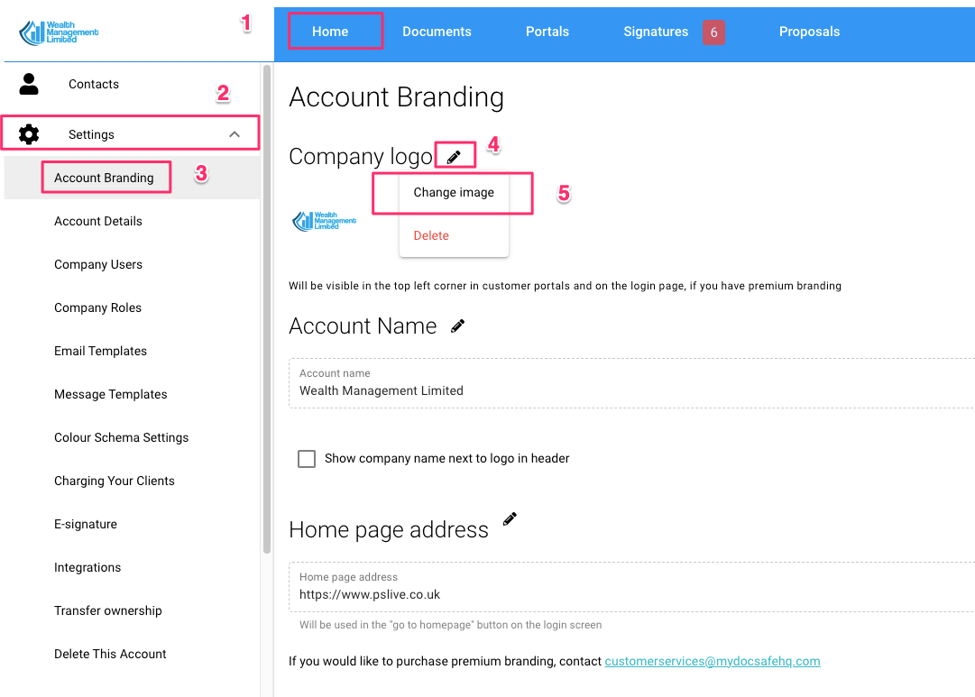 Puede agregar su logotipo a los portales MyDocSafe yendo a la sección Marca de la cuenta en Configuración.