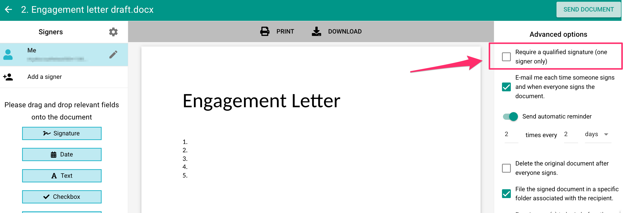 Ahora que es suscriptor, puede activar la función de Firma Electrónica Cualificada (FEC), si la necesita (FEC es un concepto de la UE utilizado principalmente en la Unión Europea). Simplemente active la opción al enviar un documento para su firma: