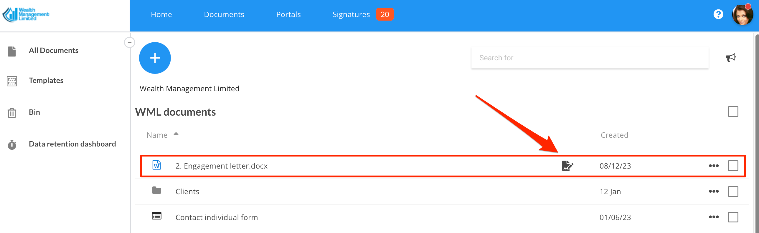 Observará que el documento que envió tiene un nuevo icono de "bolígrafo" junto al nombre del archivo. Este icono oculta el informe de estado de esta transacción de diseño electrónico.