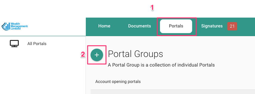 1. Desde el panel principal, haga clic en "Portales" y en el botón "+" y cree su primer grupo de portales.