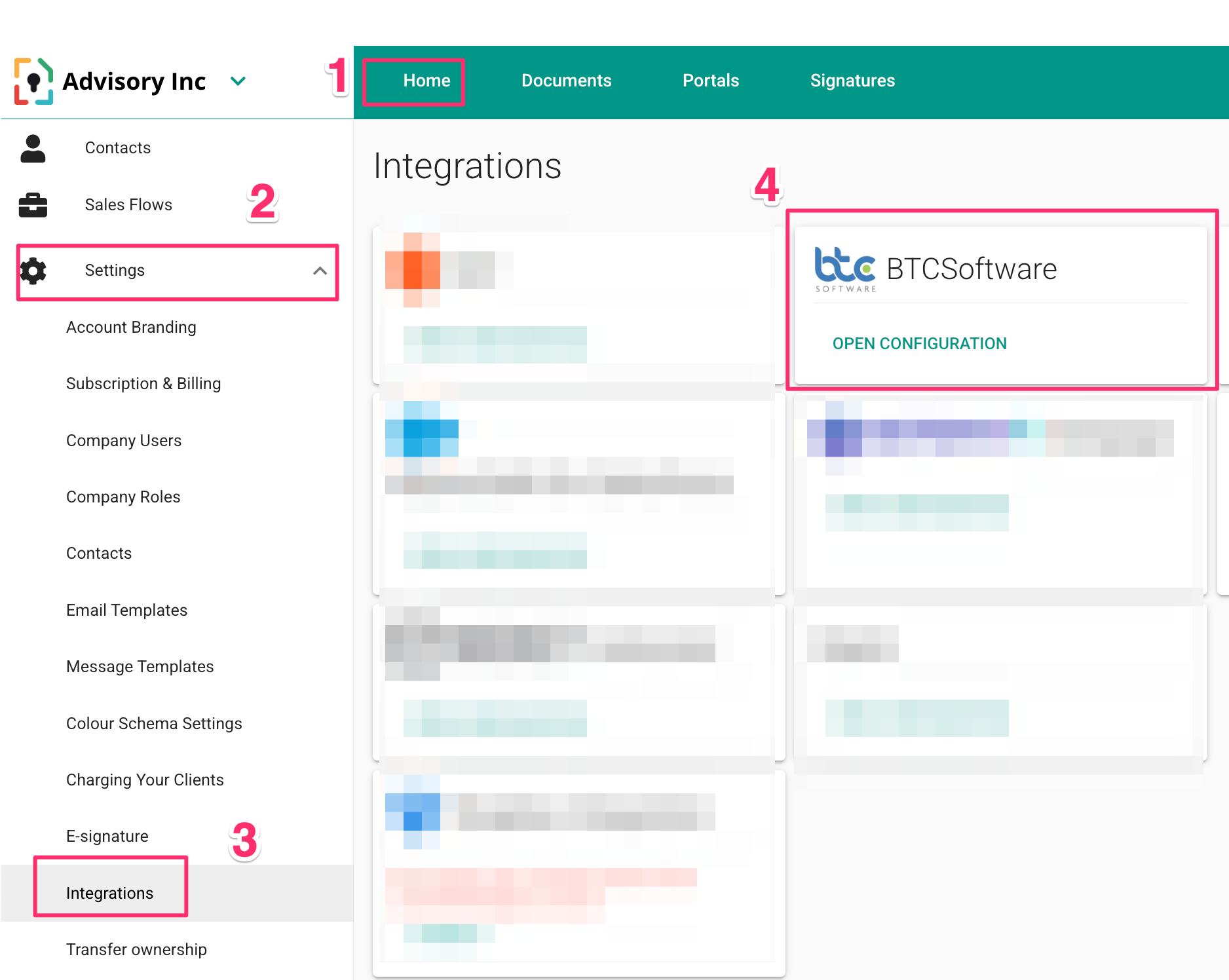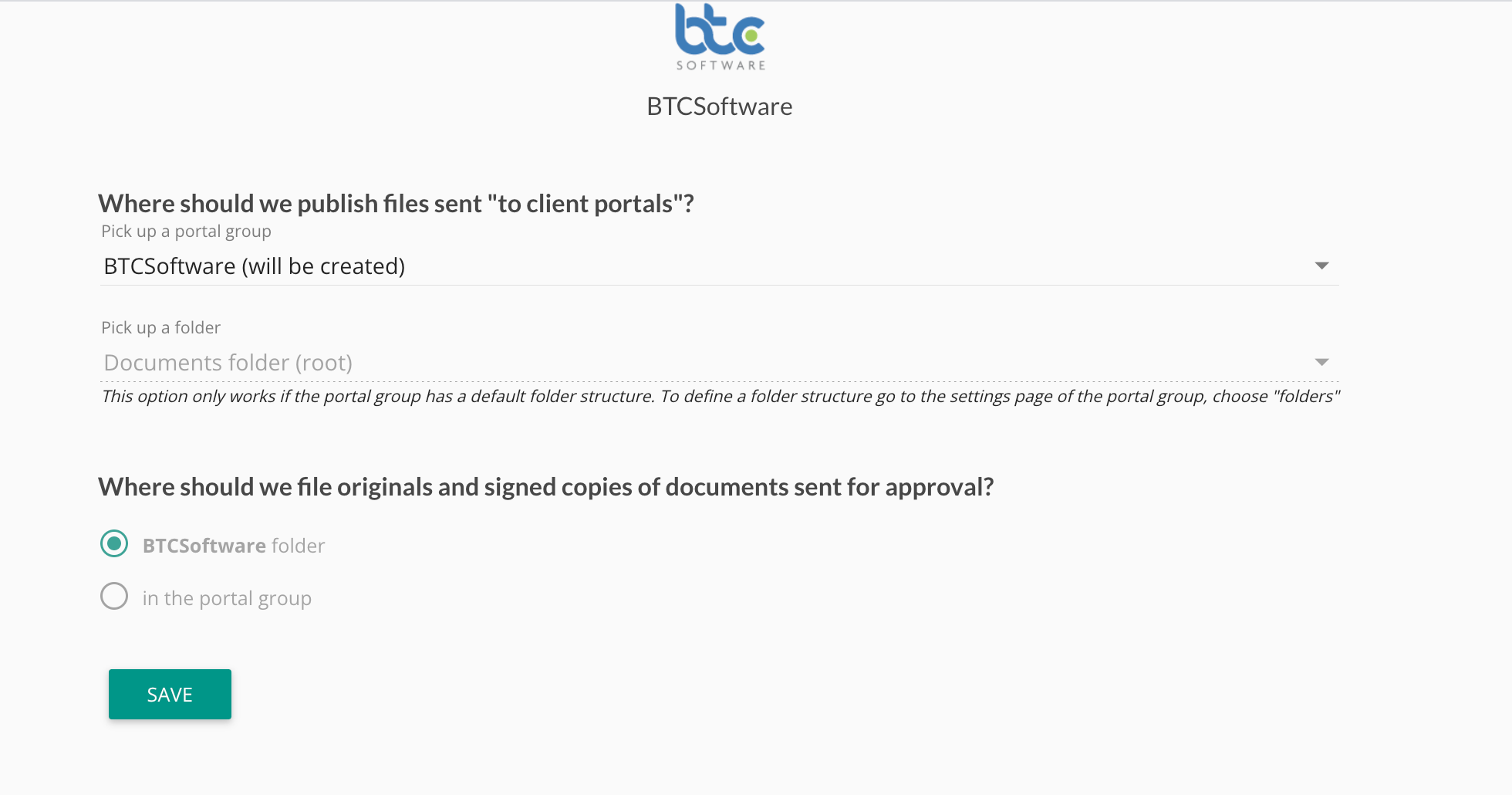Domyślnie dokumenty przesłane do podpisu elektronicznego i ich podpisane wersje są zapisywane w folderze BTCSoftware w katalogu głównym w katalogu MyDocSafe. Ponadto dokumenty publikowane w portalach klientów są zapisywane w grupie portali „BTCSoftware”, która jest tworzona automatycznie. System tworzy portal w tej grupie i zaprasza do niego klienta. Może to nie być oczekiwane, jeśli korzystasz z innych grup portali do komunikacji z klientem. Aby zmienić te ustawienia, zaloguj się do katalogu MyDocSafe, przejdź do sekcji Strona główna/Ustawienia/Integracje/BTCSoftware i kliknij „Otwórz konfigurację”, aby edytować ustawienia, określając miejsce zapisywania podpisanych i opublikowanych dokumentów.