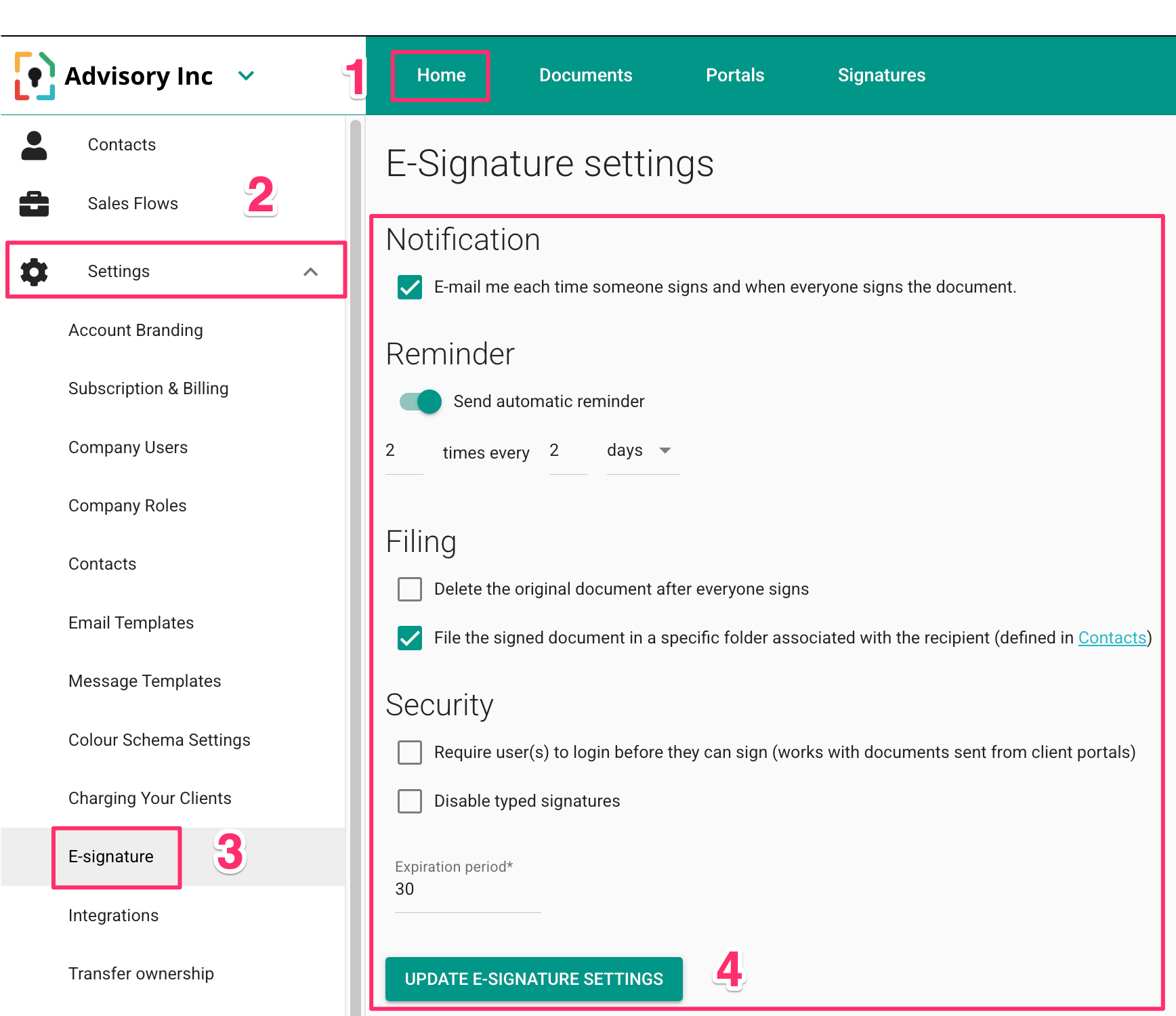 Należy pamiętać, że można zdefiniować globalne ustawienia podpisu elektronicznego, które zostaną zastosowane przez BTCSoftware. Aby uzyskać dostęp do ustawień, przejdź do „...” -> „Ustawienia firmy” -> „Podpis elektroniczny”.