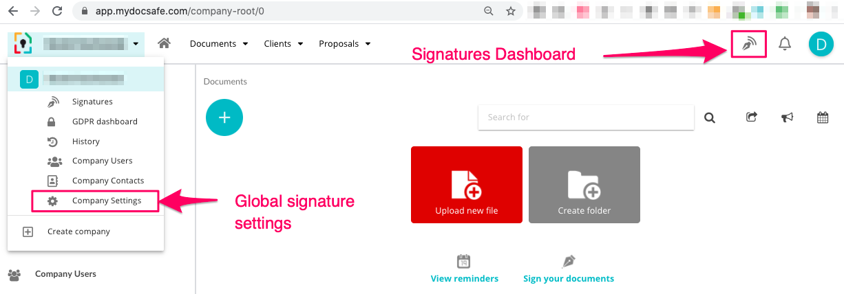 b. Alternatywnie, przejdź do globalnych ustawień e-podpisu (ikona w lewym górnym rogu -> ustawienia firmy -> e-podpis) i ustaw tam automatyczne przypomnienia.