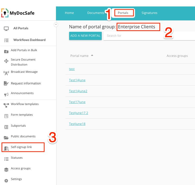 Es ist möglich, einen Link zur Selbstregistrierung in Kundenportalen zu erstellen. Diese Option ist besonders nützlich, wenn Sie Ihre Kunden bitten möchten, ein in ein Portal eingebettetes Formular auszufüllen und zu unterschreiben, aber keine Zeit haben, jeden Kunden einzeln einzuladen.