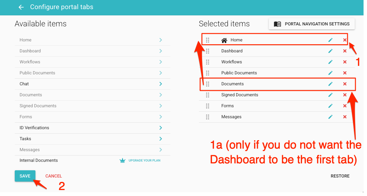 Asegúrese de que Inicio no esté en la parte superior. Opcionalmente, mueva Documentos a la parte superior si no desea que el Panel de Control sea la primera pestaña predeterminada. Recomendamos mantener el Panel de Control como la primera pestaña, ya que proporciona información útil y se puede configurar para mejorar la experiencia del cliente.