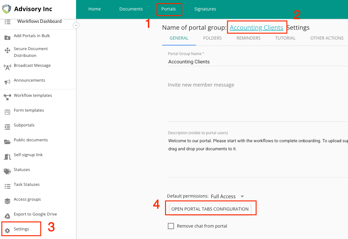 Para encontrar la página de configuración, vaya a Portales, seleccione su Grupo de portales de clientes, luego Configuración y el botón "Abrir configuración de pestaña" en la pestaña General.