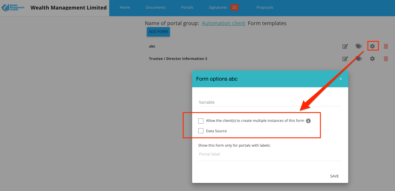 Si desea utilizar un formulario en un portal, asegúrese de que las configuraciones de formulario denominadas "Permitir que los clientes creen múltiples instancias de este formulario" y "Fuente de datos" estén marcadas.