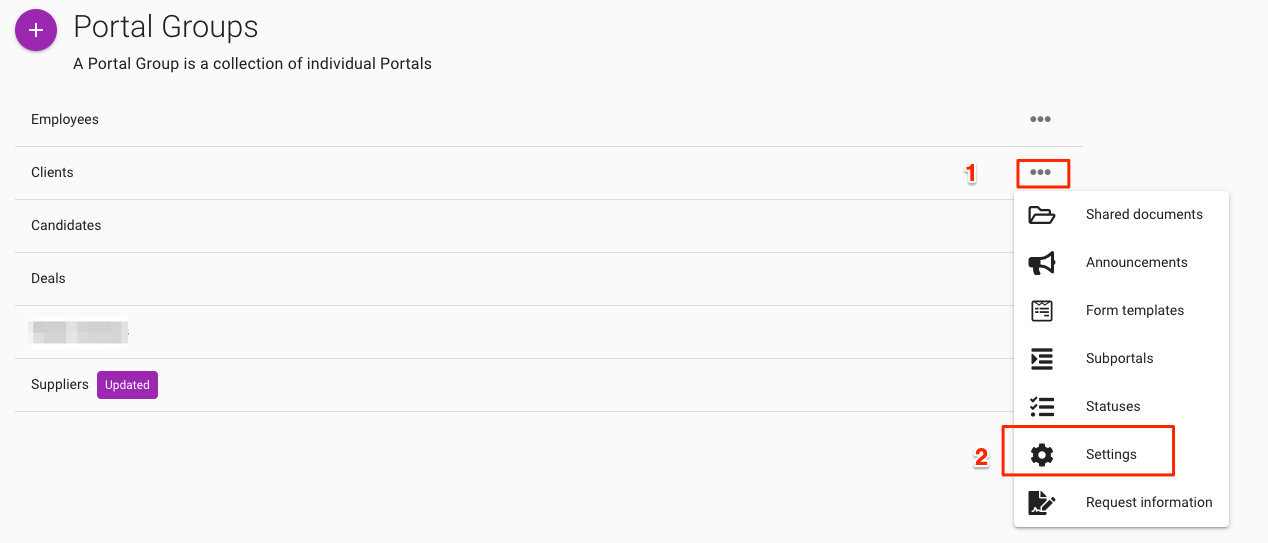 Per eliminare un gruppo portale, fare clic sull'icona '...' associata al gruppo e selezionare Impostazioni