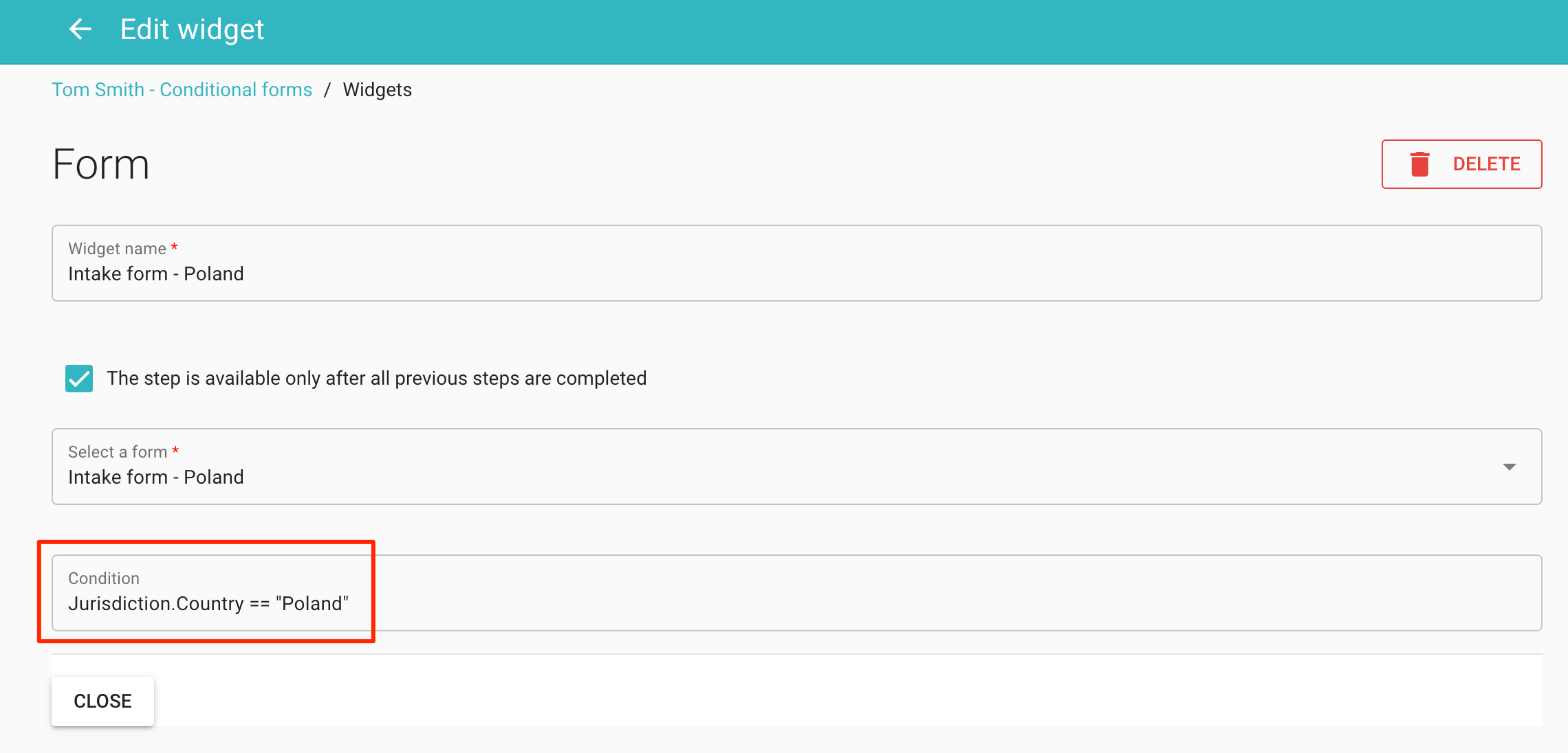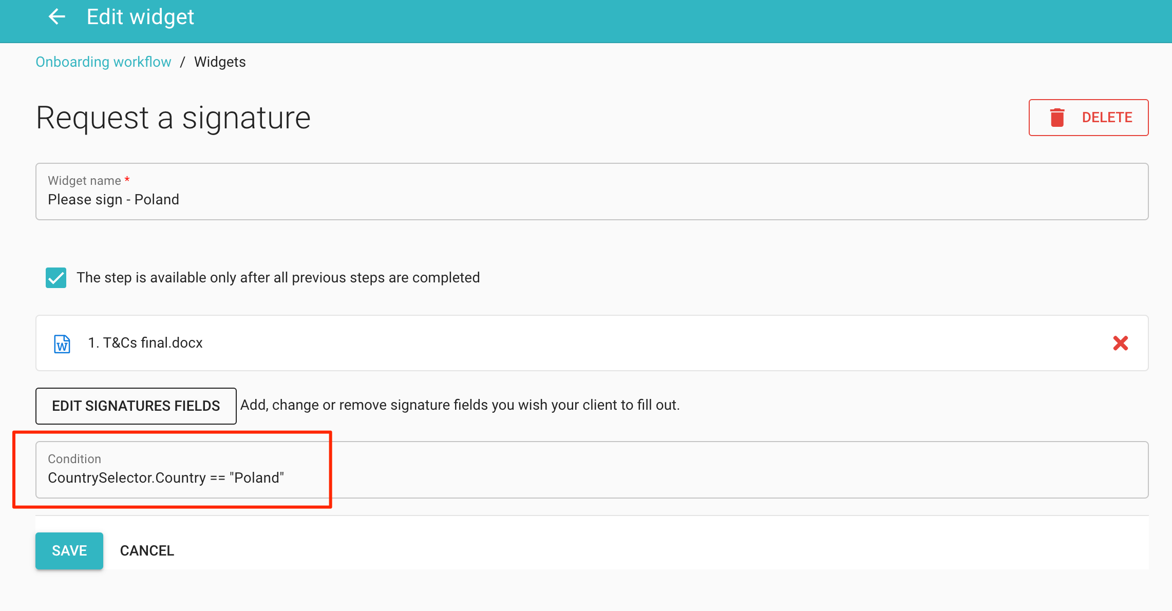 Przejdź do wybranego portalu klienta i wybierz zakładkę „Przepływy pracy” (jeśli nie jest włączona, włącz ją w sekcji „Portale/Grupa portalu/Ustawienia/Ogólne/Otwórz konfigurację zakładki portalu). Na karcie „Przepływy pracy” kliknij przycisk „+”, aby rozpocząć tworzenie przepływu pracy. Dodaj kwestionariusz. Następnie dodaj dowolną liczbę widżetów „żądanie podpisu” lub „formularz”. Dla każdego widżetu zdefiniuj odpowiedni warunek. Na przykład, jeśli chcesz, aby dokument lub formularz pojawiał się tylko po wybraniu „Polska”, dodaj warunek, taki jak „CountrySelector.Country == „Polska”. Zwróć uwagę, że „CountrySelector” to nazwa zmiennej kwestionariusza, „Country” to nazwa zmiennej pytania wielokrotnego wyboru, a „Polska” to żądana opcja. Pamiętaj o podwójnym znaku równości (tak, wygląda to dziwnie, pracujemy nad lepszym rozwiązaniem).