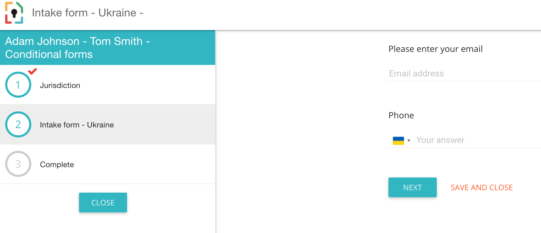 Twój klient zobaczy tylko istotne opcje. W poniższym przykładzie widoczny jest tylko kwestionariusz „Jurysdykcja”. Pozostałe opcje pojawią się dopiero PO wypełnieniu i przesłaniu kwestionariusza.
