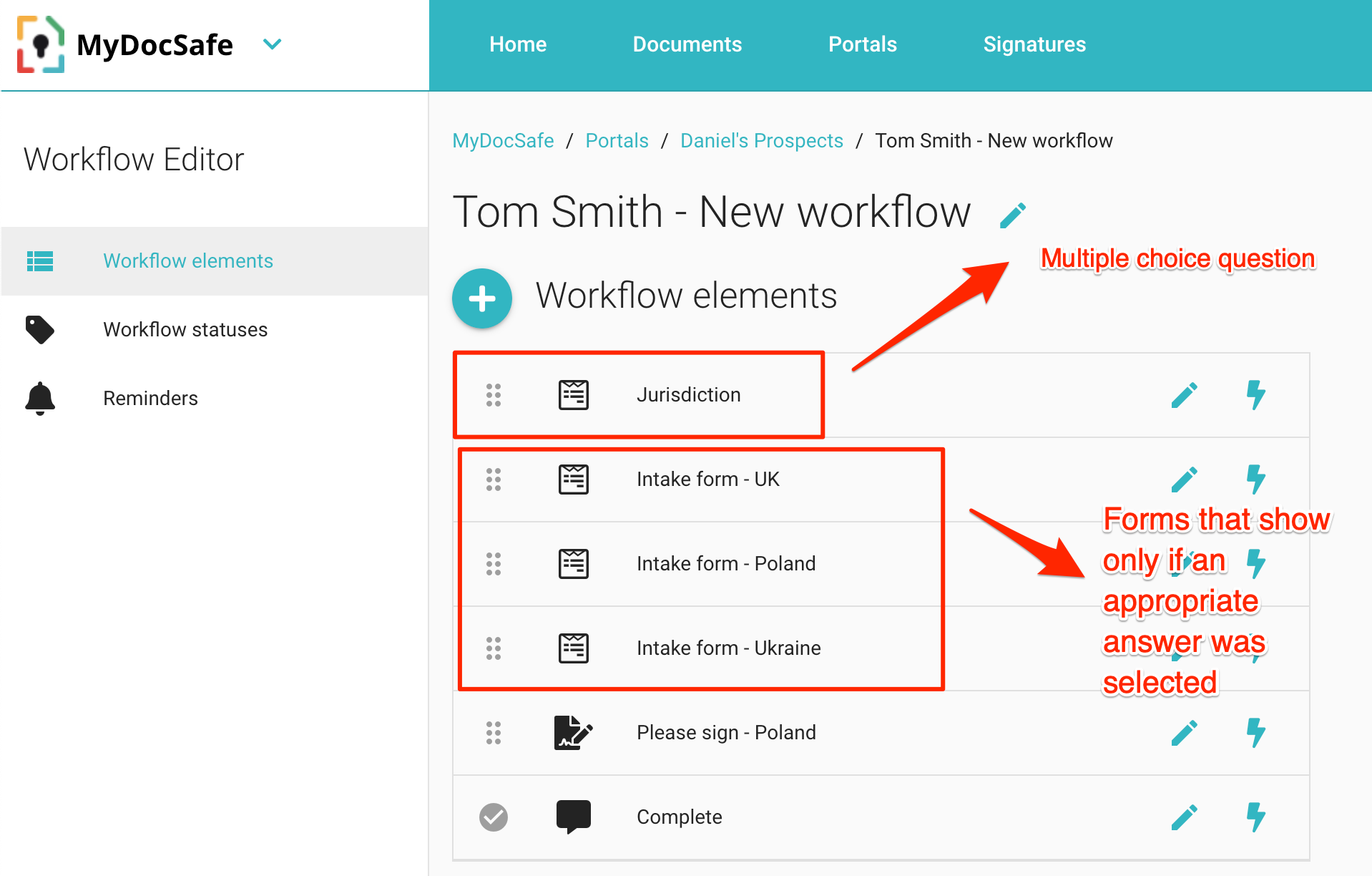 Na przykład, jeśli w kroku „Jurysdykcja” wybrana zostanie opcja „Polska”, a klient kliknie „Dalej”, przepływ pracy zostanie przekonfigurowany tak, aby wyświetlać tylko istotne dokumenty i formularze: