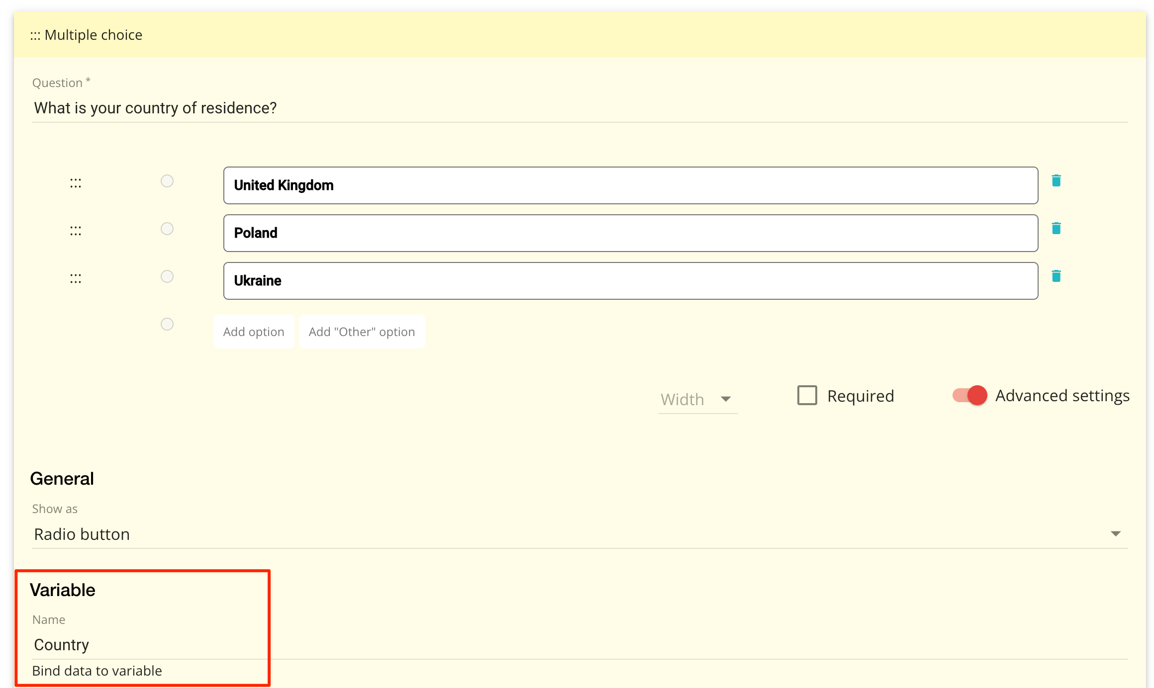 Następnie kliknij „Dodaj formularz”, aby utworzyć kwestionariusz. Dodaj swoje pytania. W przypadku tego typu warunków zalecamy użycie widżetu pytań wielokrotnego wyboru. Upewnij się, że masz włączone ustawienia zaawansowane i zdefiniuj nazwę zmiennej dla widżetu.