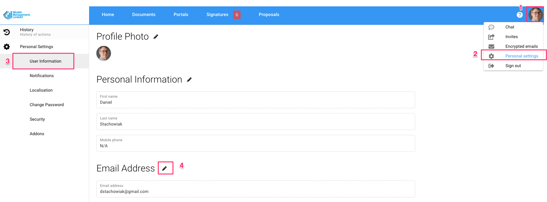 Перейдіть до Особистих налаштувань -> Інформація про користувача та вкажіть нову адресу.