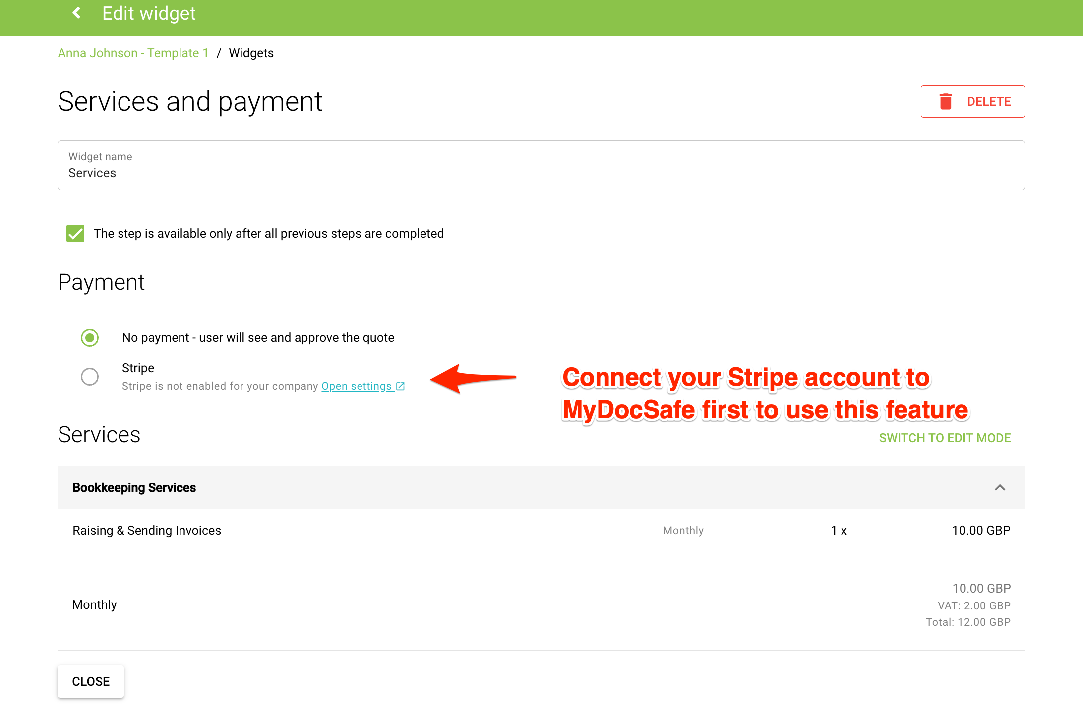 4. A note on Services & Payment widget: if you would like to ask your prospects to accept the quote AND pay or set up a payment method, you will need to connect your Stripe account to MyDocSafe first.